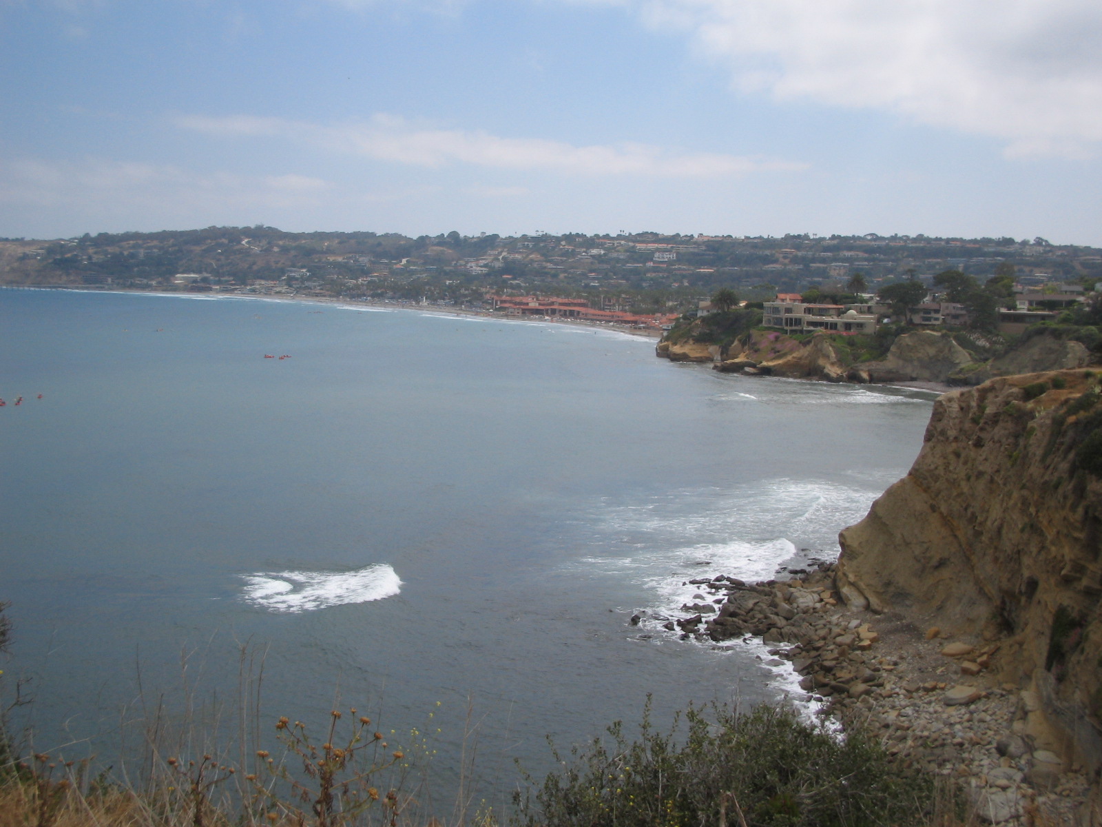 Directions from downtown La Jolla: Head South on Coast Blvd. past Coast Boulevard Park (The grassy fields to the right). You’ll veer slightly away from the ocean into a neighborhood on this road. You’ll see two large white apartment buildings before you hit Prospect St. If you see Prospect St. you’ve gone too far. Between these white apartment buildings is a cement walkway that leads down to the beach. You should see a horseshoe if you’re in the right place.