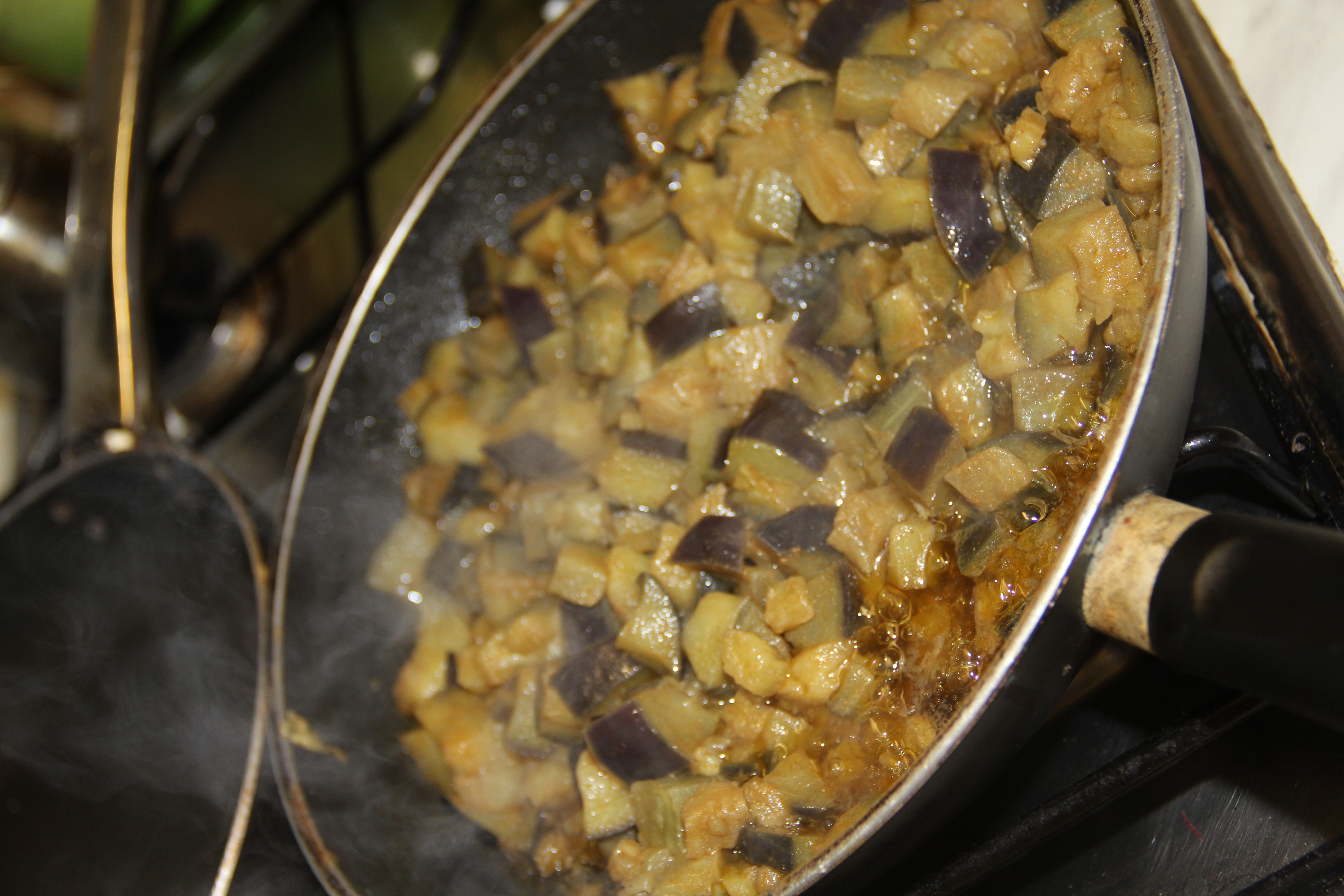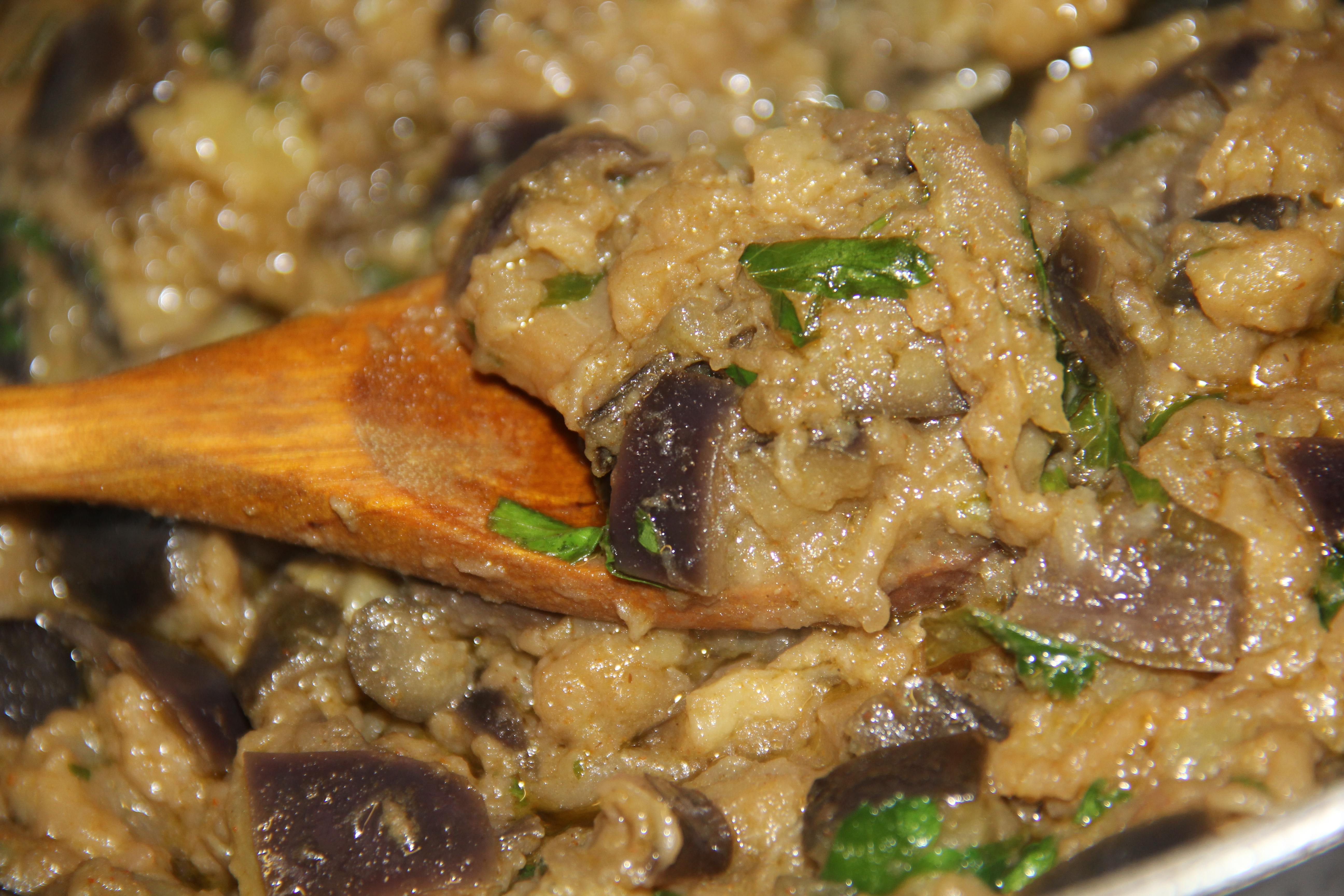 Place eggplant, garlic, spices and oil into a large pan over medium heat. Cover and cook for 30-40 minutes or until eggplant is tender and no longer bitter. Stir every 10 minutes adding a little water as the liquid cooks down. When eggplant is tender and no longer white add parsley, stir and remove from heat.