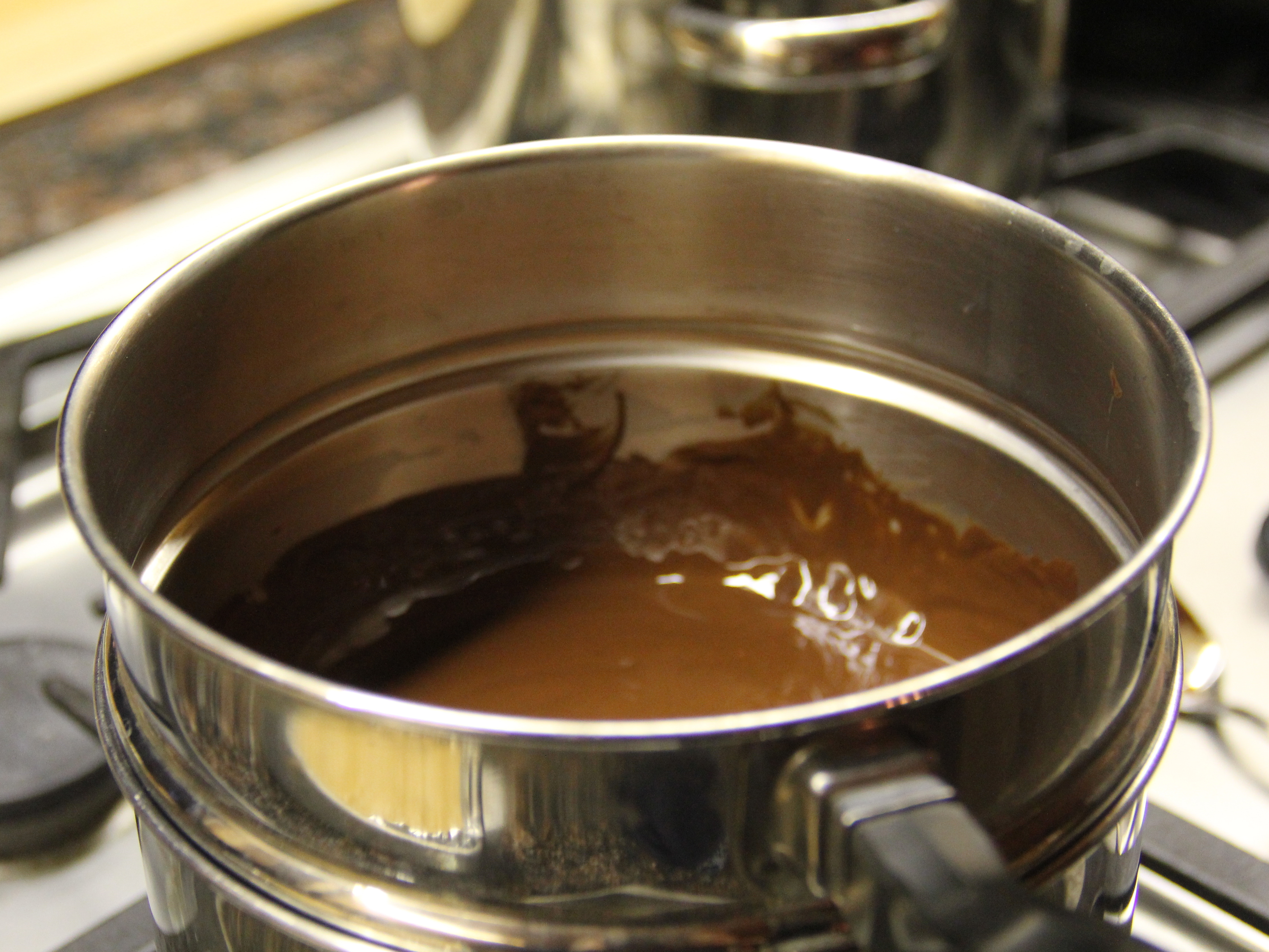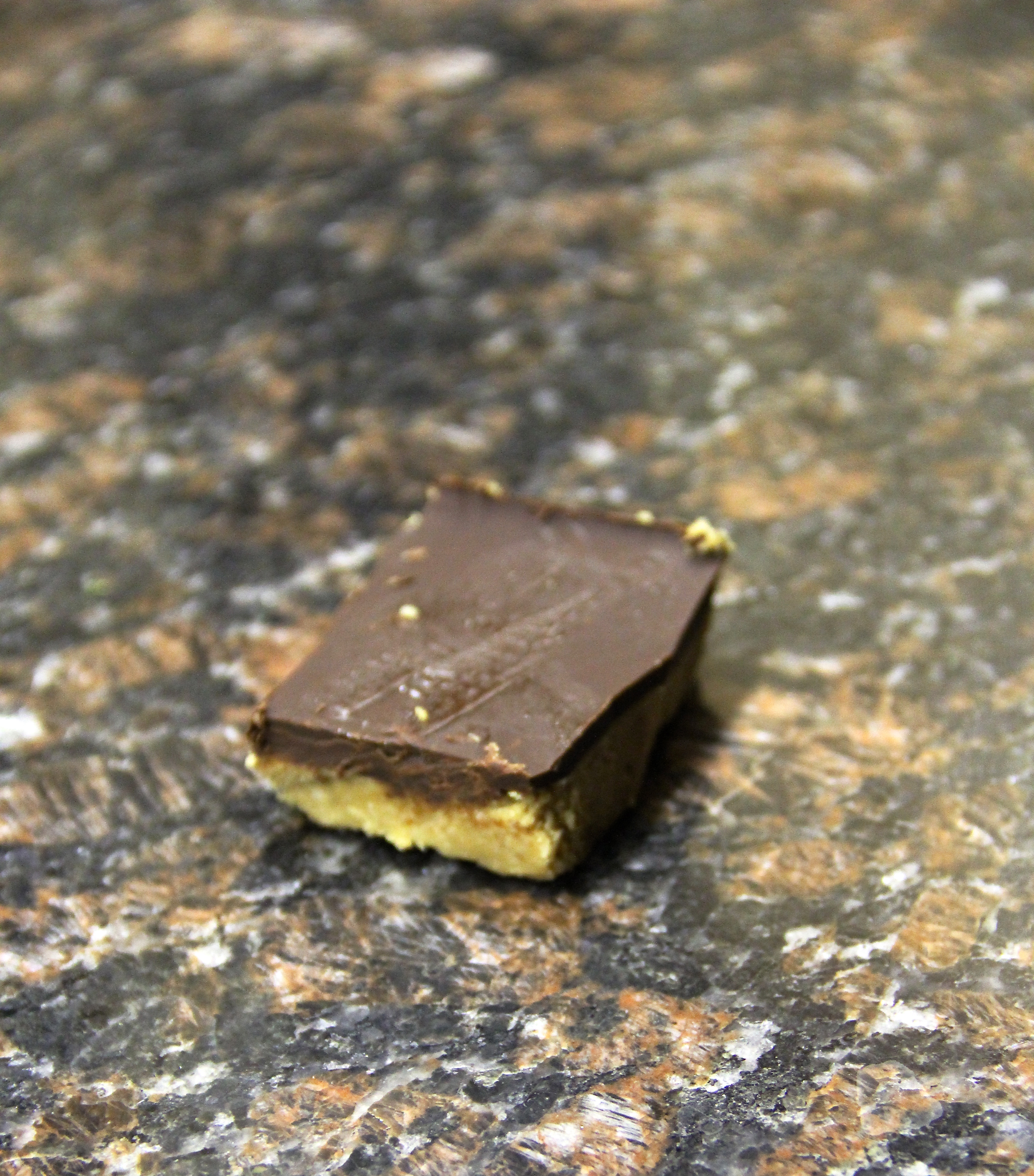 Melt Chocolate in a double boiler. Wait till cools slightly and pour over packed peanut butter layer. Cool for at least 30 minutes in freezer.