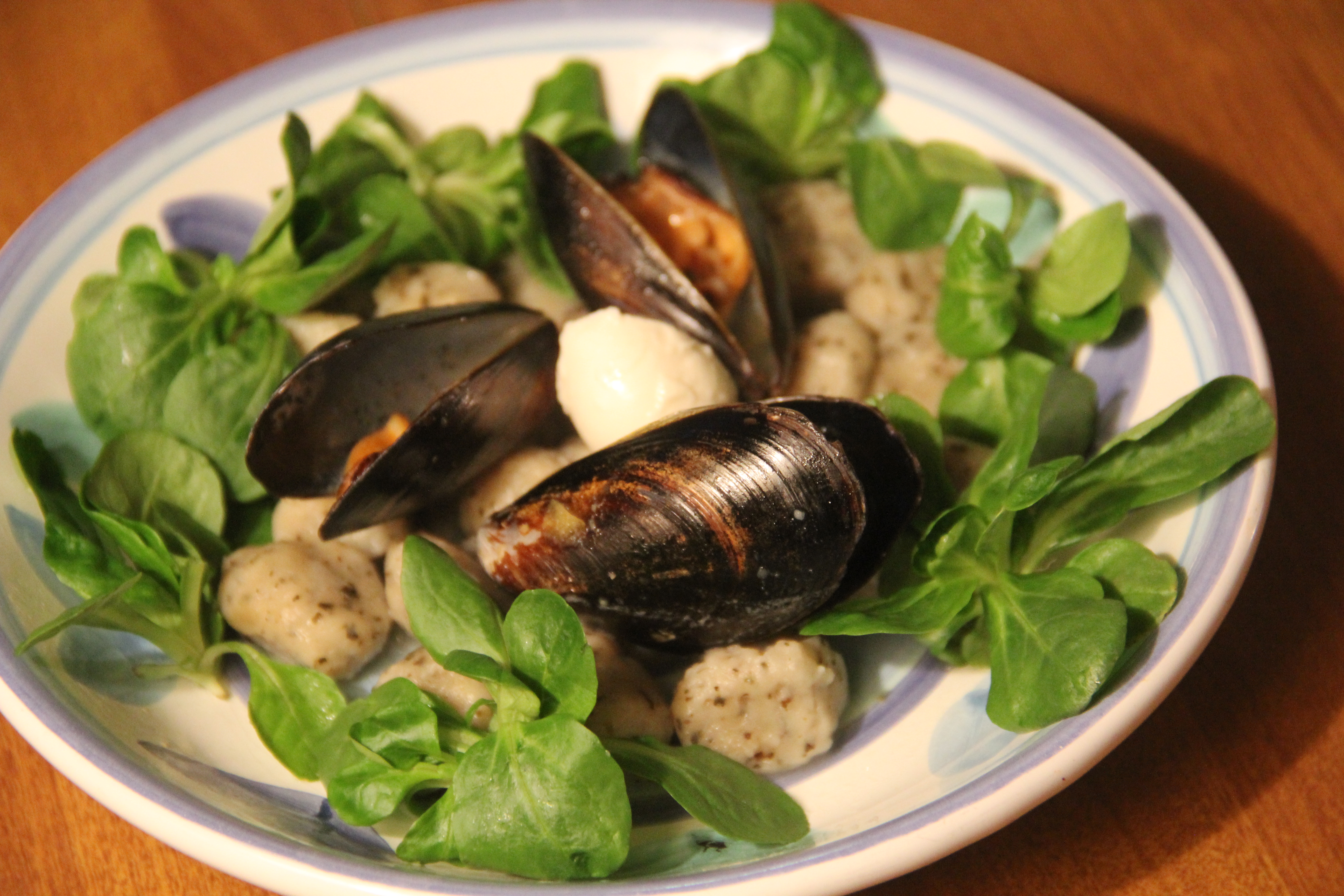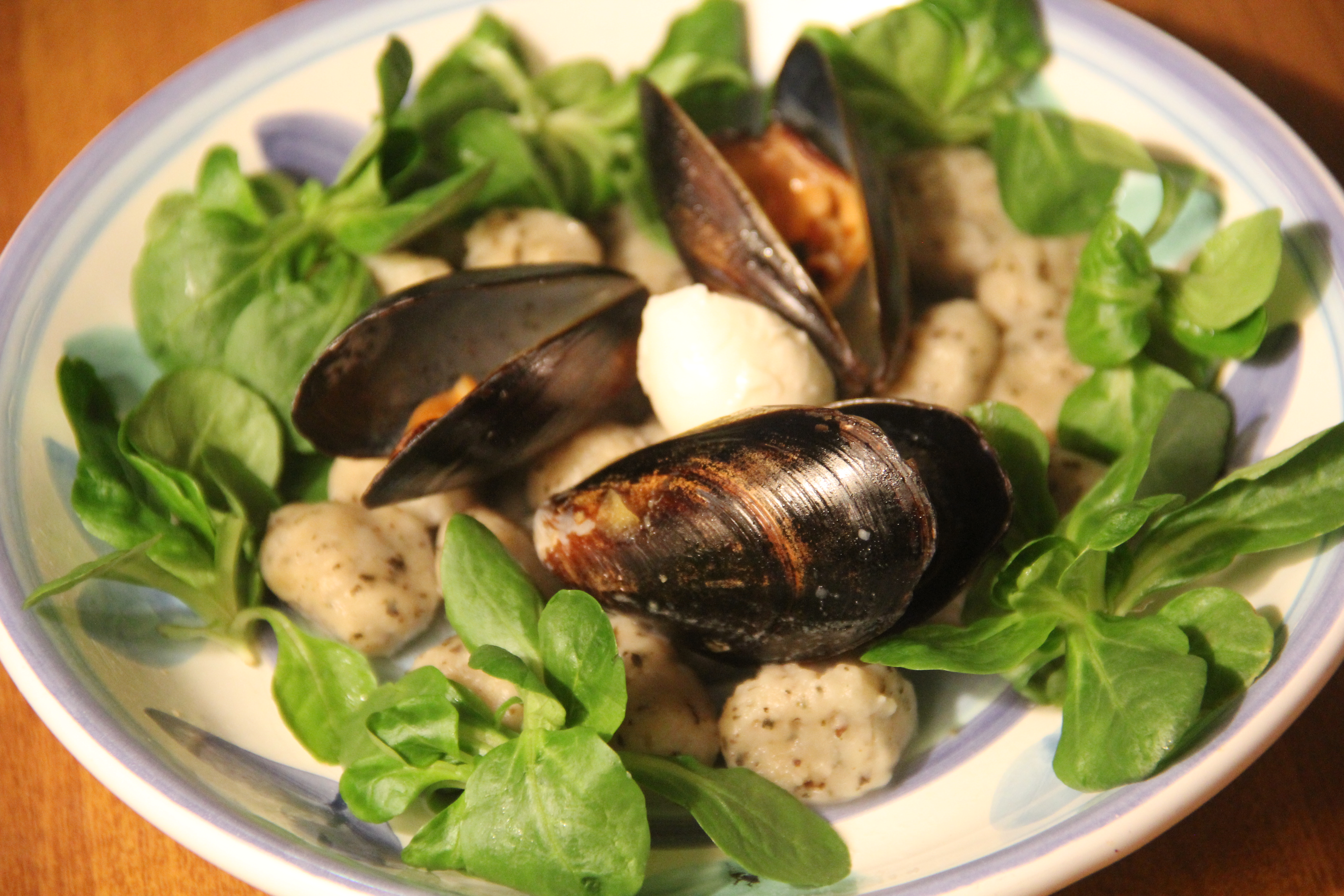Mussels on a Bed of Basil Gnocchi and Mache Rosettes