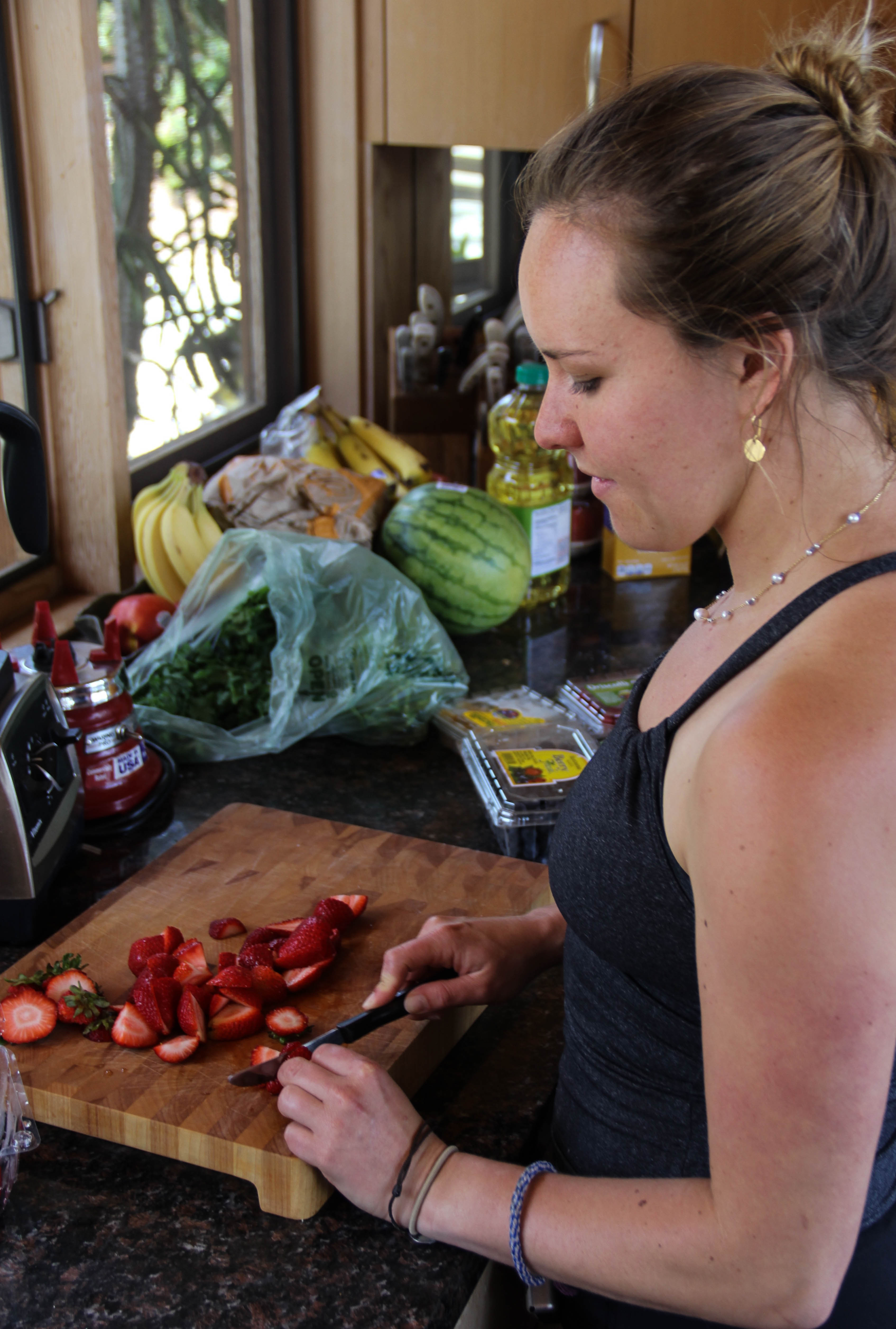 chopping strawberries