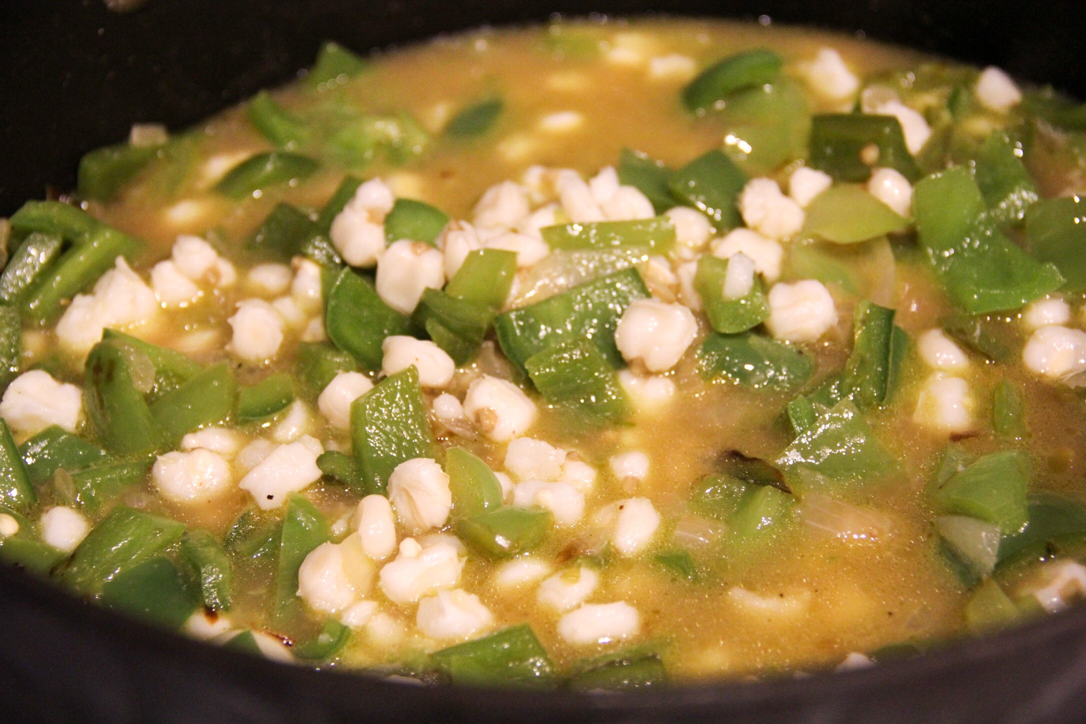 Place hominy in cold water and set aside to soak while preparing other ingredients.