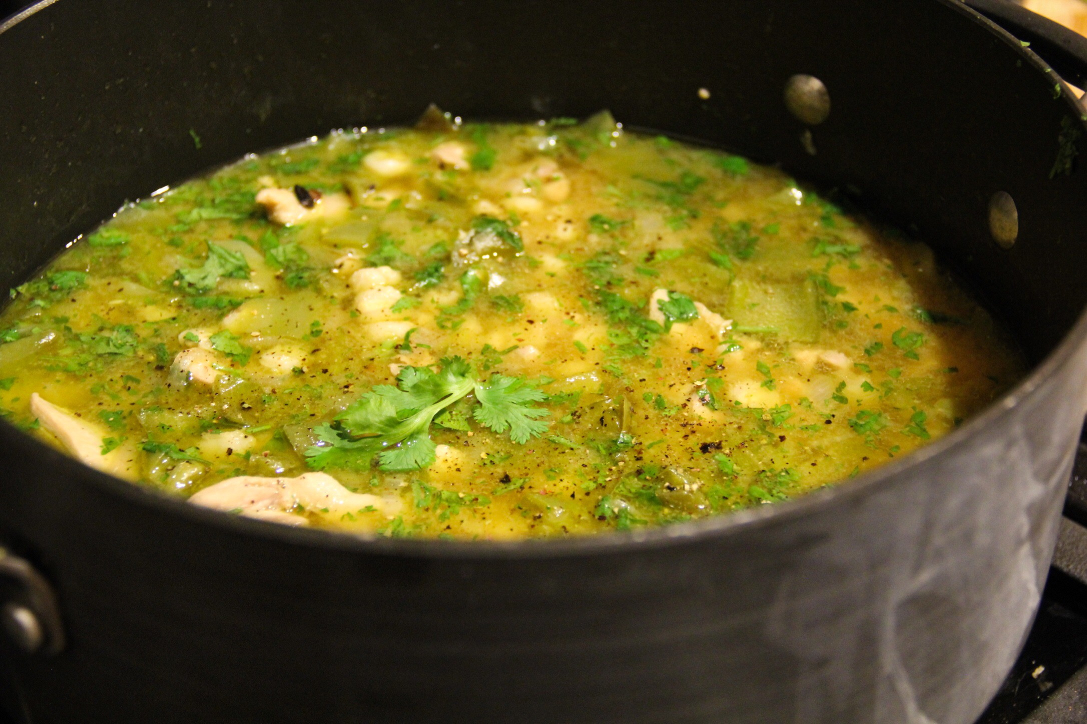 Add chicken stock, chicken thighs, lime zest, and hominy. Turn heat up to high and bring to a boil.