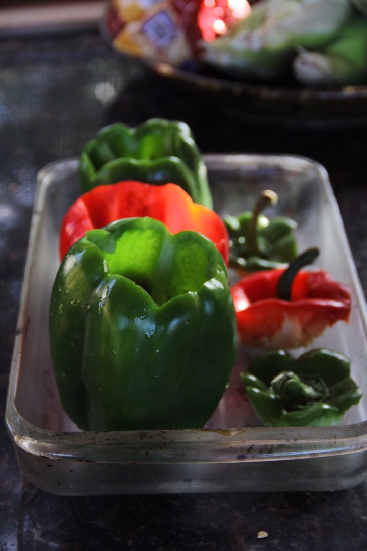 Remove the tops of your peppers. Clean out seeds and white innards. Place peppers upright in a large glass pan